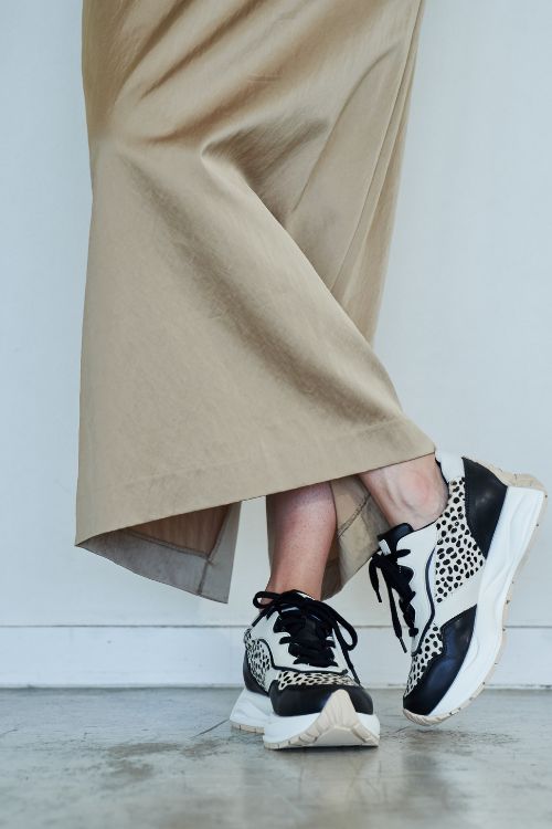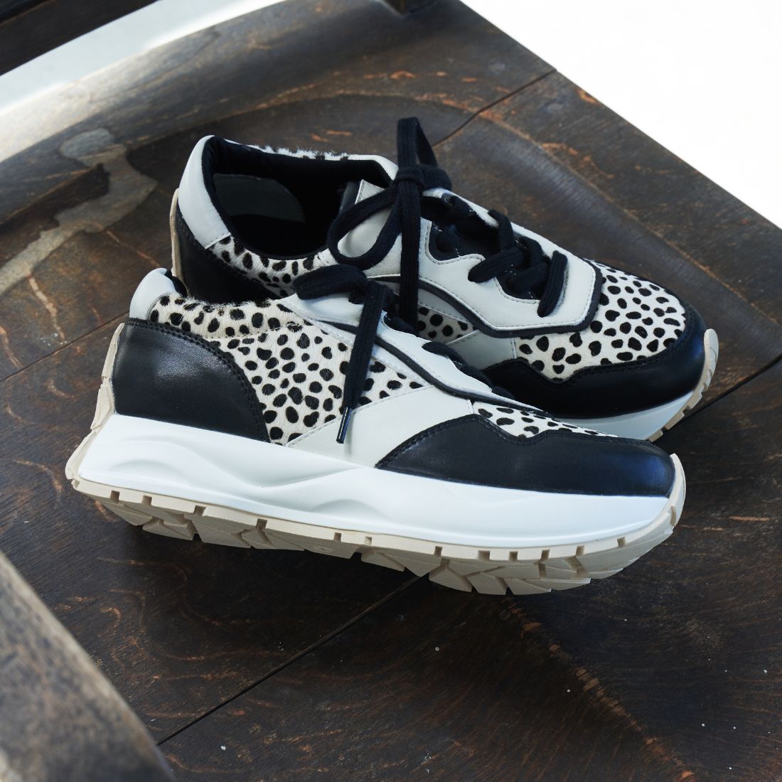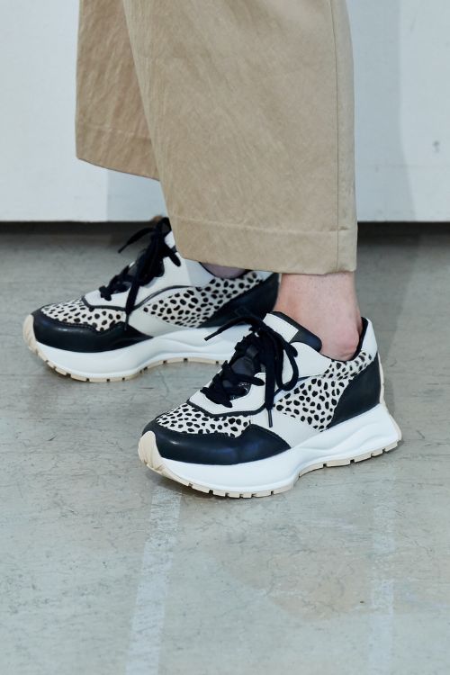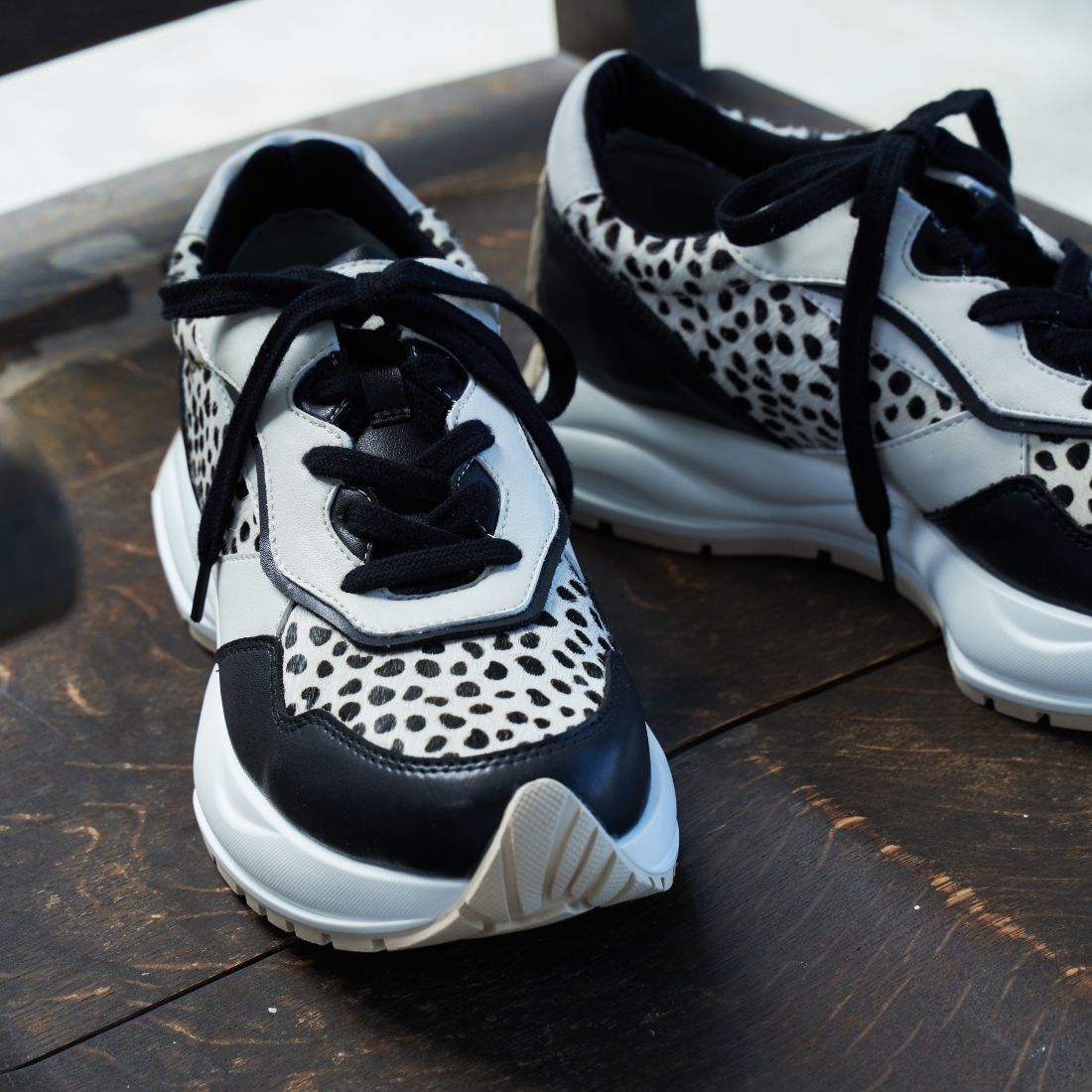 特徴的な柄でも、ベーシックな黒とアイボリーが落ち着いた印象に。足元からこなれ感を演出するデザイン。本ハラコとスムース素材を複数組み合わせる事で、大人な洗練されたデザインに。アウトソールには、ナチュラルな印象になるようにベージュカラーに仕上げました。シューレース部分のカッティングにも拘り、異素材を重ねる事で、高級感を演出してくれます。