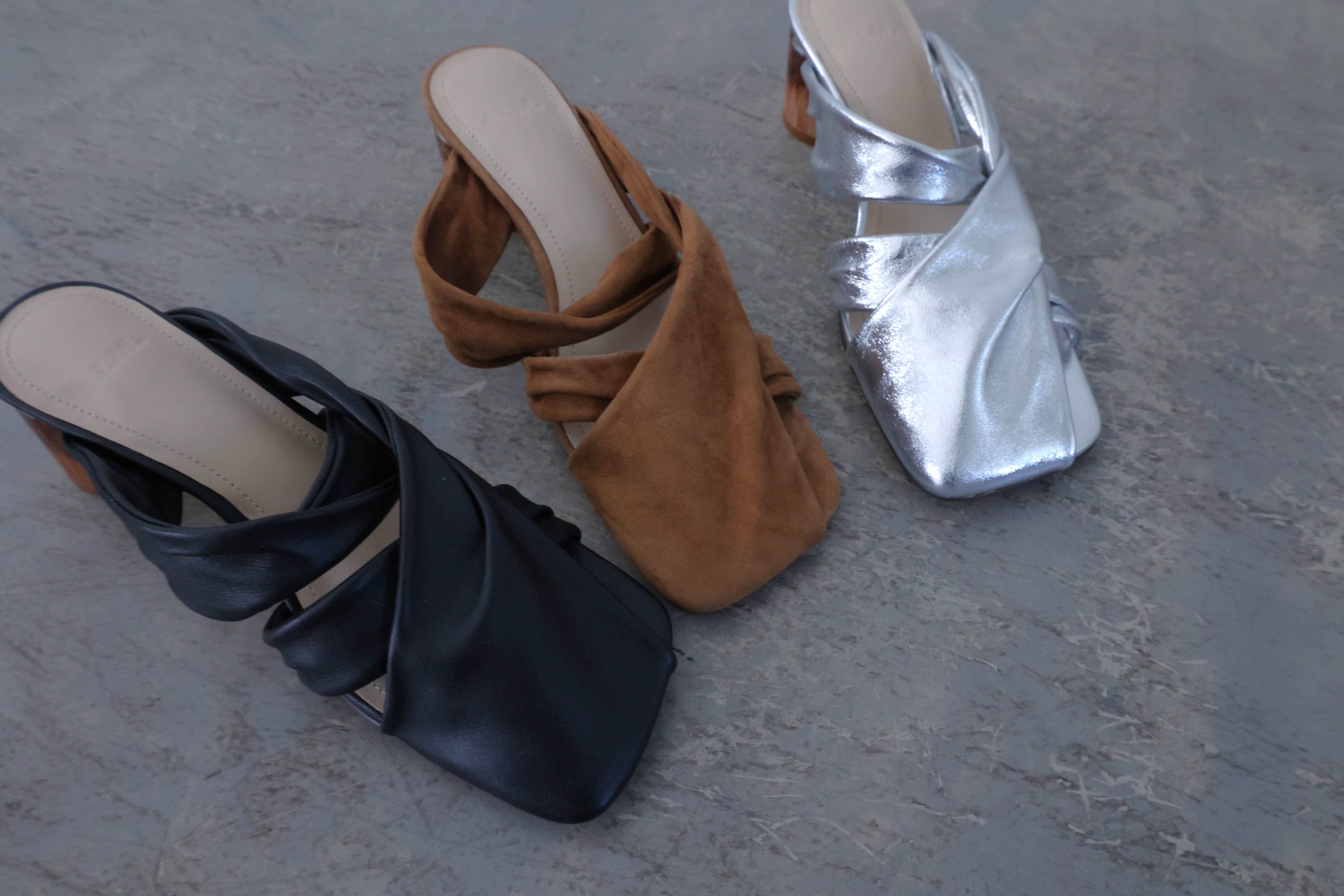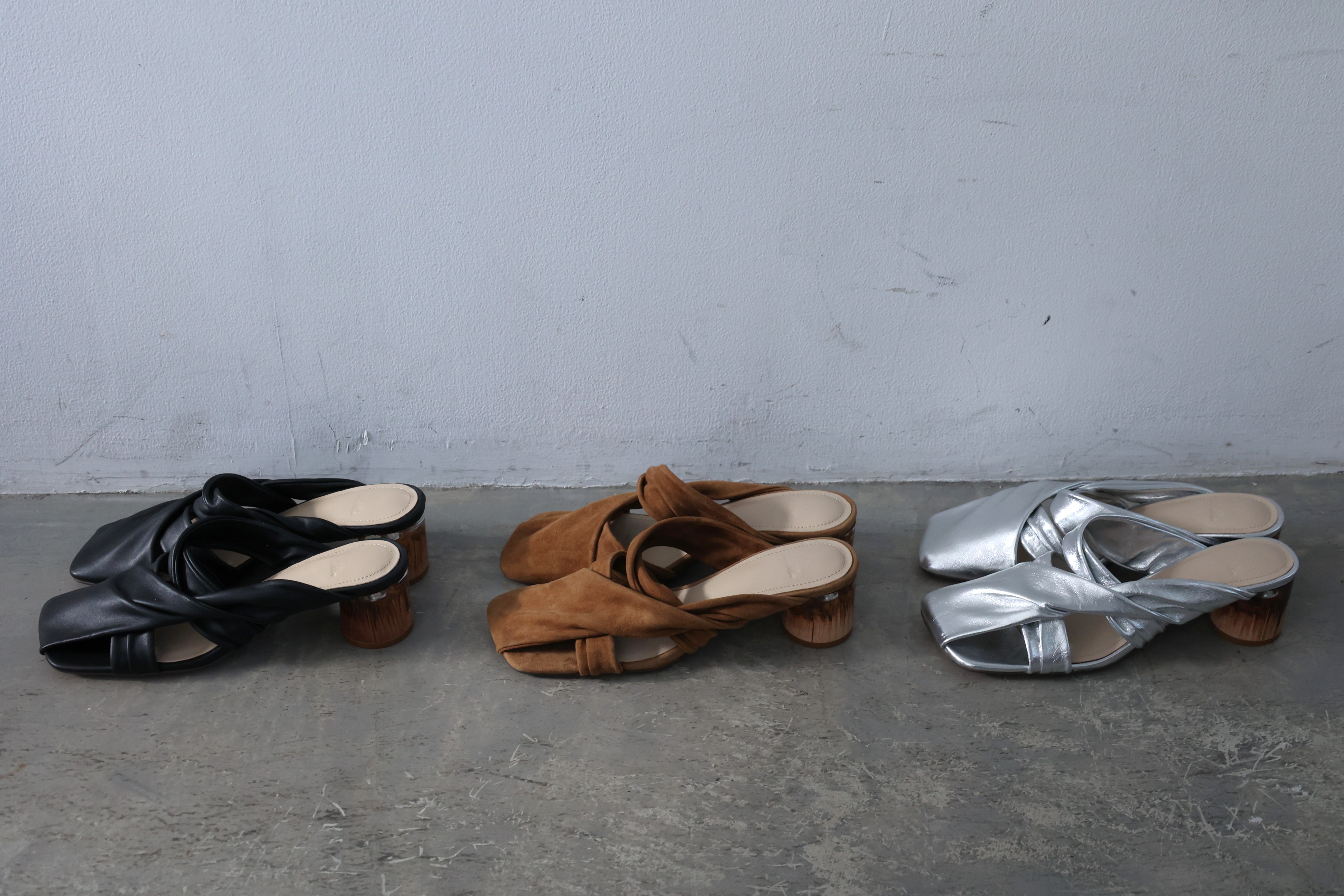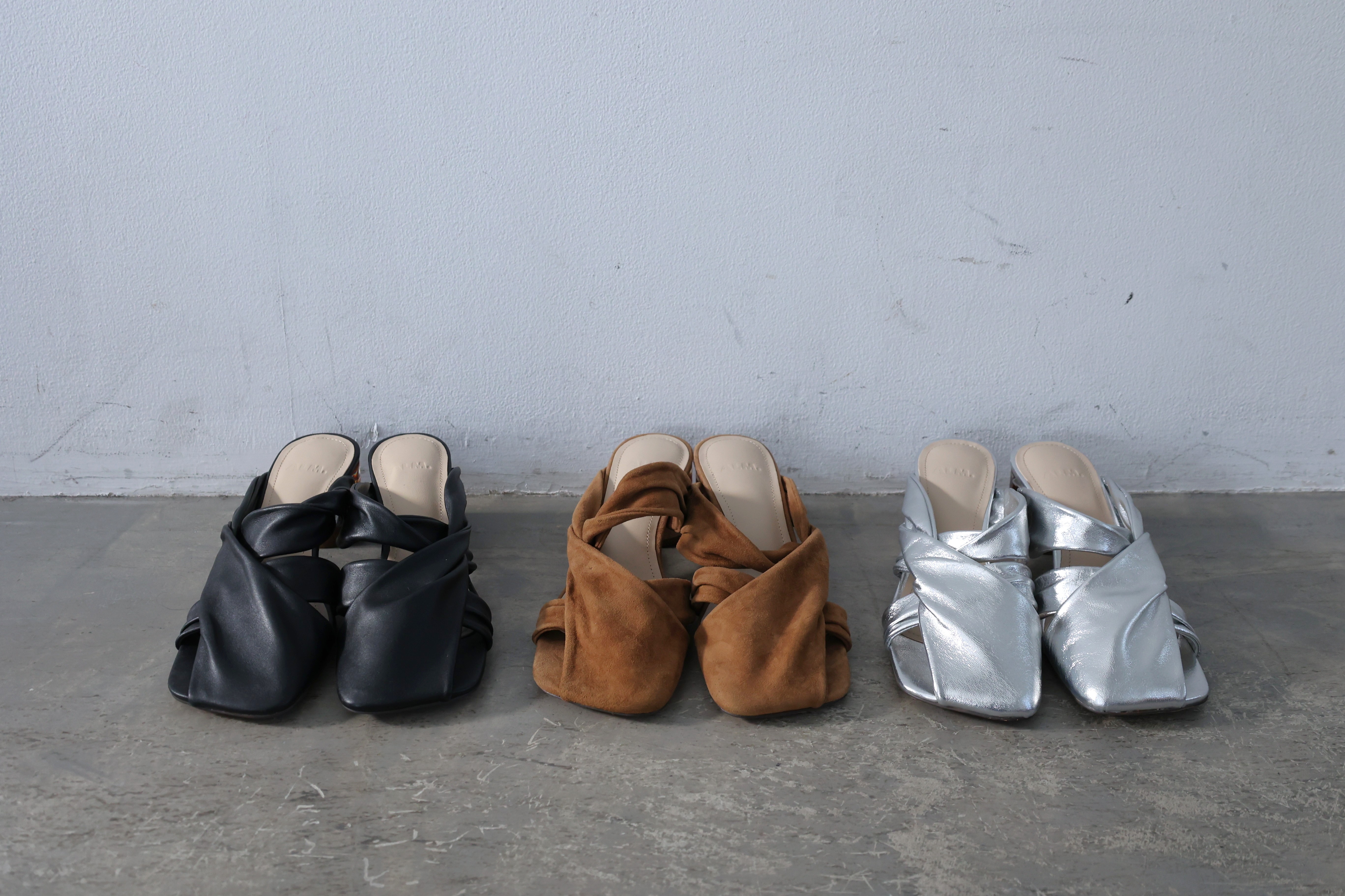ALM定番のオブジェヒールを使った、新作のツイストデザインミュール。