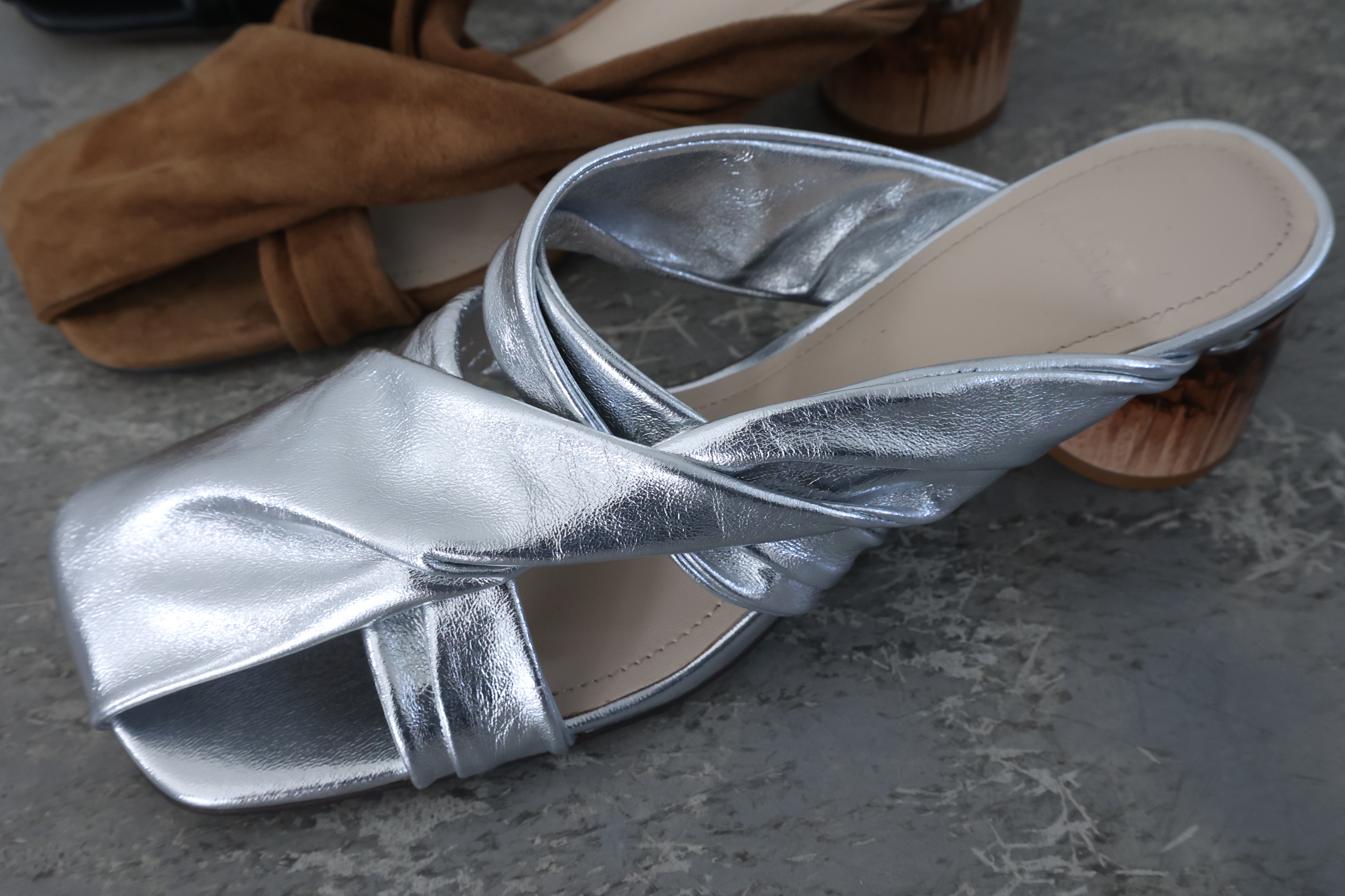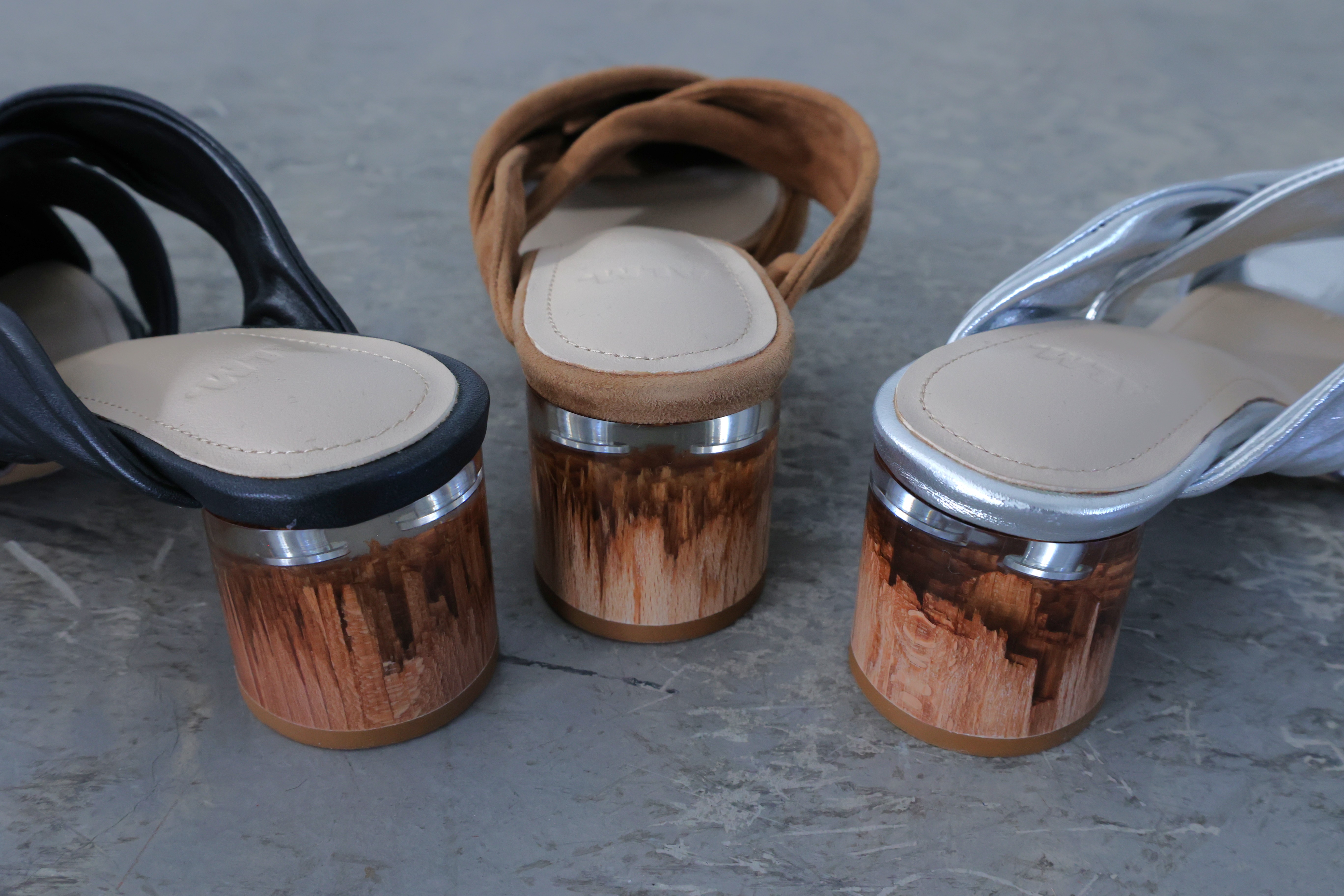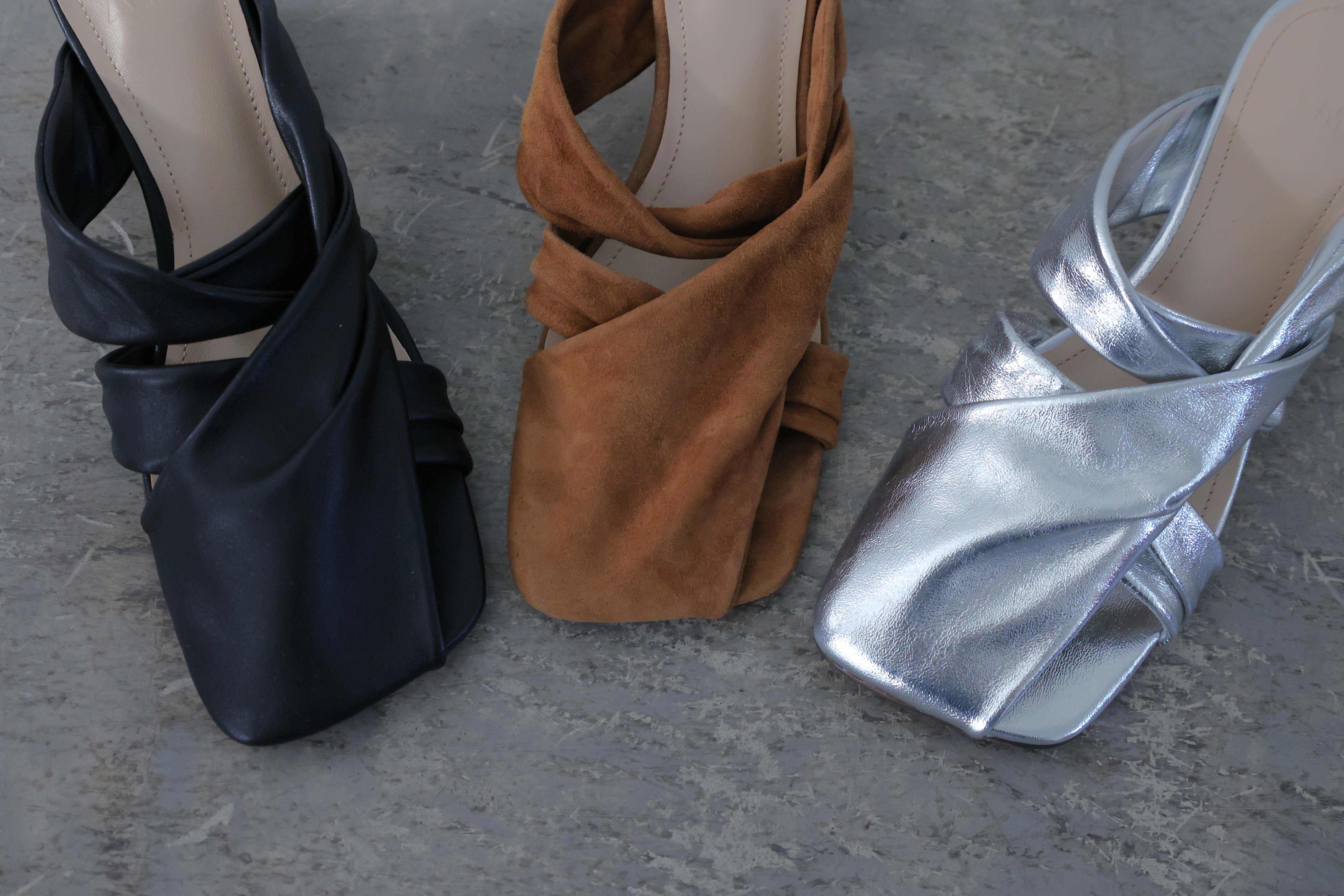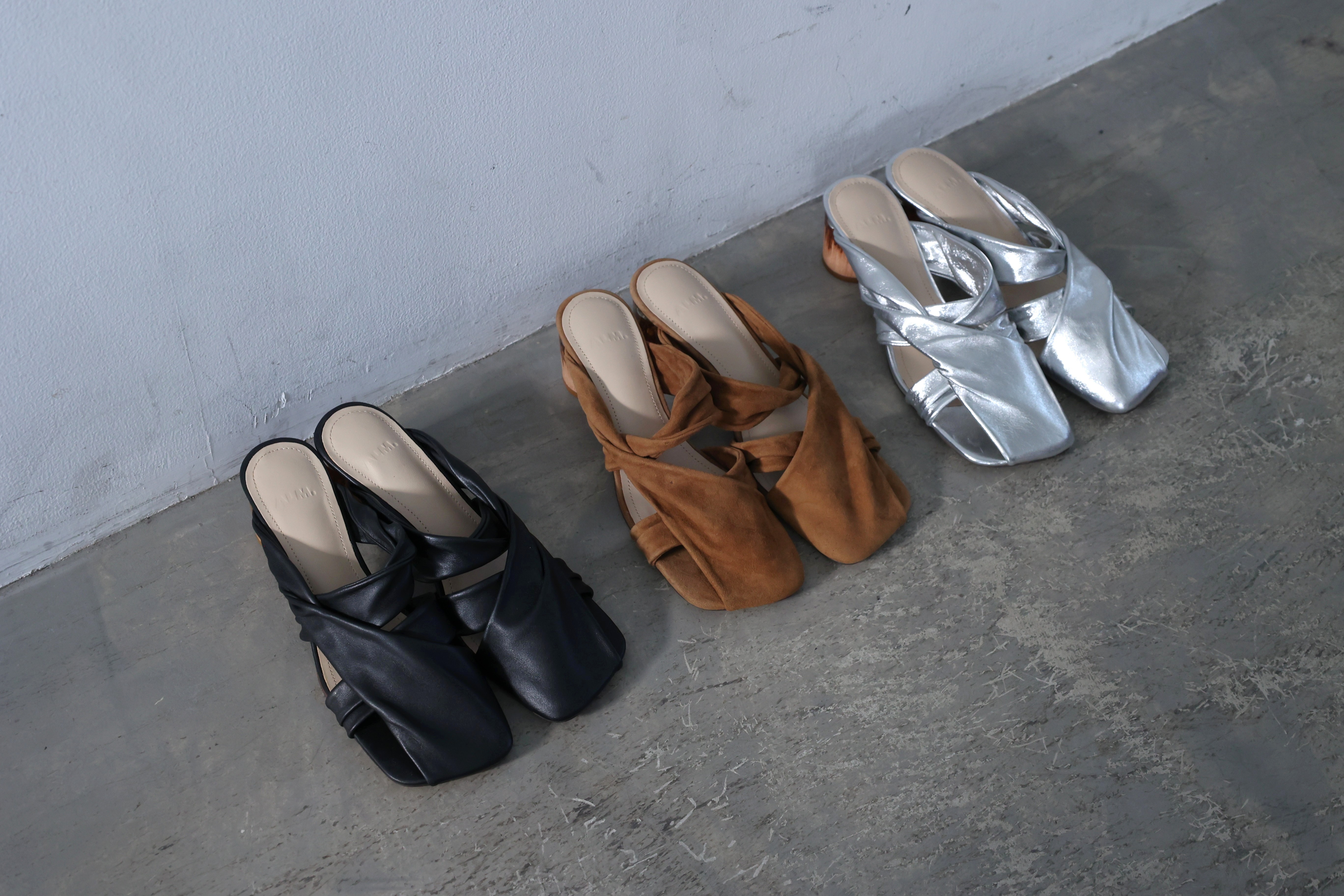ALM定番のオブジェヒールを使った、新作のツイストデザインミュール。