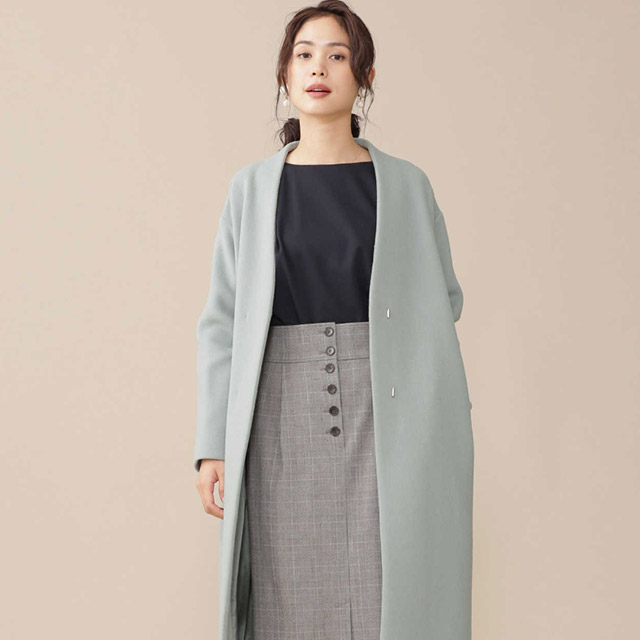 襟がないことで胸元がスッキリして洗練されたきれいめなスタイリングを作ってくれるノーカラーコート。上品で女性らしいシルエットなのでデートや合コンにおすすめのアウターです。