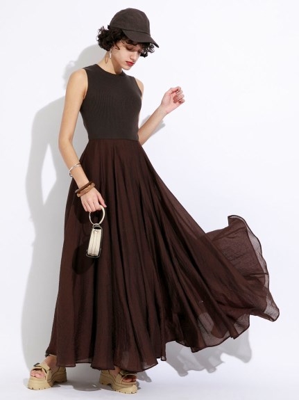 全身をブラウンでまとめた大人のカジュアルコーデ。キャップやスポサンのカジュアルアイテムとシアーのフレアスカートでリラクシーな雰囲気に。ブラウンなどの落ち着いたカラーでワントーンコーデをするときは重く見える可能性があるため、シアー素材や肌見せでコーデに軽さを出そう!
