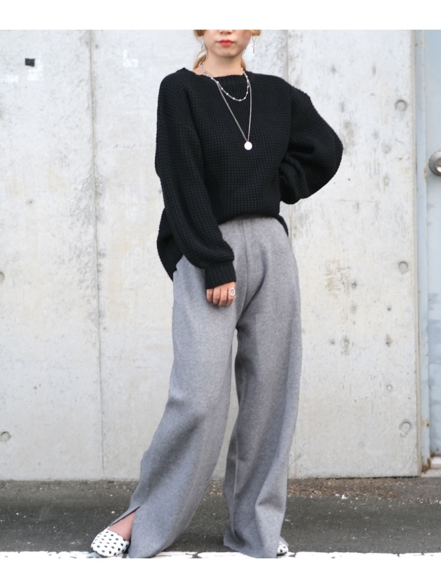 コーデの主役になってくれるスリット入りのリブパンツは、太めのワイドシルエットで気になるヒップ周りをしっかりカバー。 黒のトップスでモノトーンな配色の着こなしは、存在感のあるアクセサリーやシューズで女性らしさをプラスしてバランスをとるのが◎