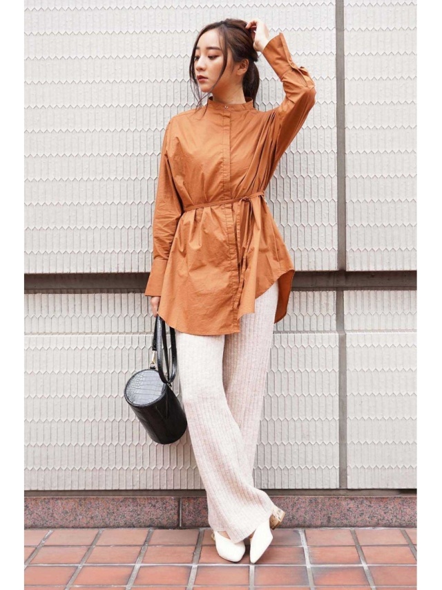 今季マストでGETしておきたいベージュ系のアイテムは、リブパンツで取り入れるのが正解! 広すぎない絶妙なワイドシルエットのリブパンツは、ブラウンカラーのブラウスと合わせて季節感のある配色。 足元はチャンキーヒールのパンプスでキレイな印象ながらも存在感のある着こなしに。