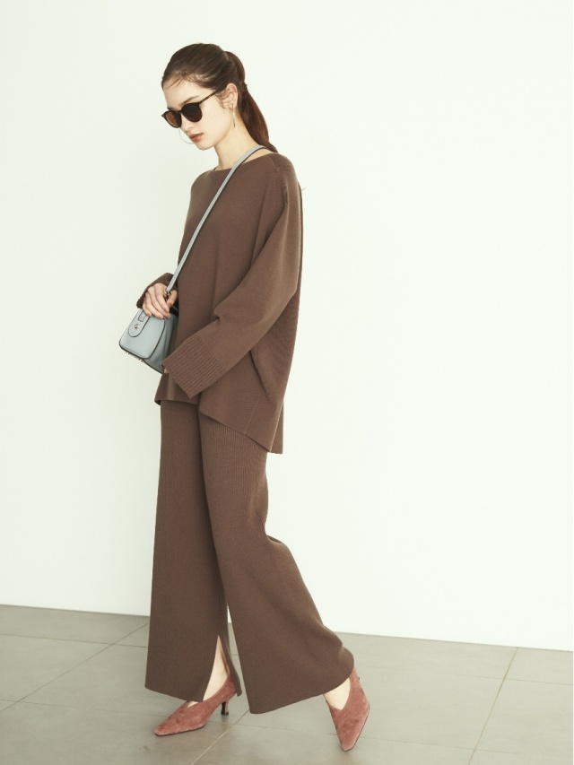 トレンドライクな着こなしはもちろん、気になるヒップ周りなどを上手にカバーしてくれるワイドシルエットのリブパンツ。 細めのリブでストレッチ効果があるので動きやすいのも嬉しいポイント! 長めのレングスのシャツをレイヤードに、キレイめボーダーニットがでリラックス感がありながらきちんと感も両立した着こなしがオススメ♪