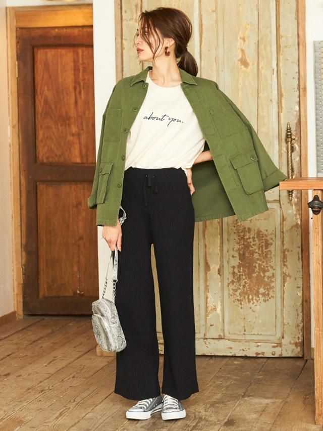 縦のラインを強調してくれるリブ編みでスタイルアップ効果が望めるこちらのパンツは、太すぎず程よいセミワイドなシルエット。 白のトップスと合わせてコーデにコントラストを出したら、ミリタリーカラーのジャケットで秋っぽく。 足元はグレーで柔らかな印象に仕上げるのが◎ 合わせる小物はパイソン柄や大振りピアスで大人のエッセンスをプラス。