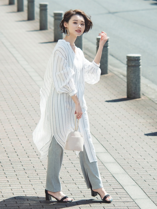 オフィスでもOKなトレンド感ときちんと感を両立したこちらの着こなしでできる“オンナ”に。 ストライプのシャツワンピースがきちんとした印象に、レイヤードのリブフレアーパンツで程よくカジュアルダウン。 スリットの入ったリブパンツはトレンドライクな着こなしにブラッシュアップしてくれます。