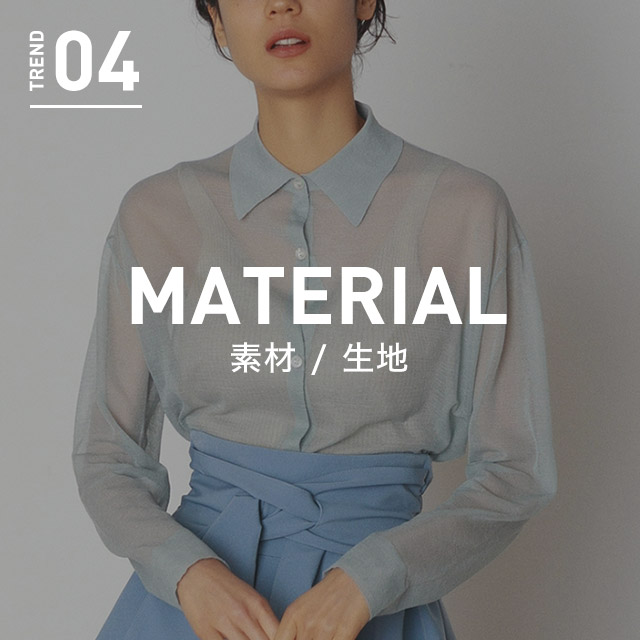 上品な肌見せがトレンドの今、透け感のあるシースルーやオーガンジー、チュール、レースで涼しさを表現するスタイルが流行ると予想。多くのブランドでシアー感のあるアイテムが続々と登場しています。トレンドカラーであるシャーベットカラー×シアーならより今年らしいスタイルが楽しめます。シャツやジャケットの袖が透けてるものなどマニッシュなアイテムにも透け素材があしらわれていて大人の女性が楽しめるラインナップも嬉しい◎